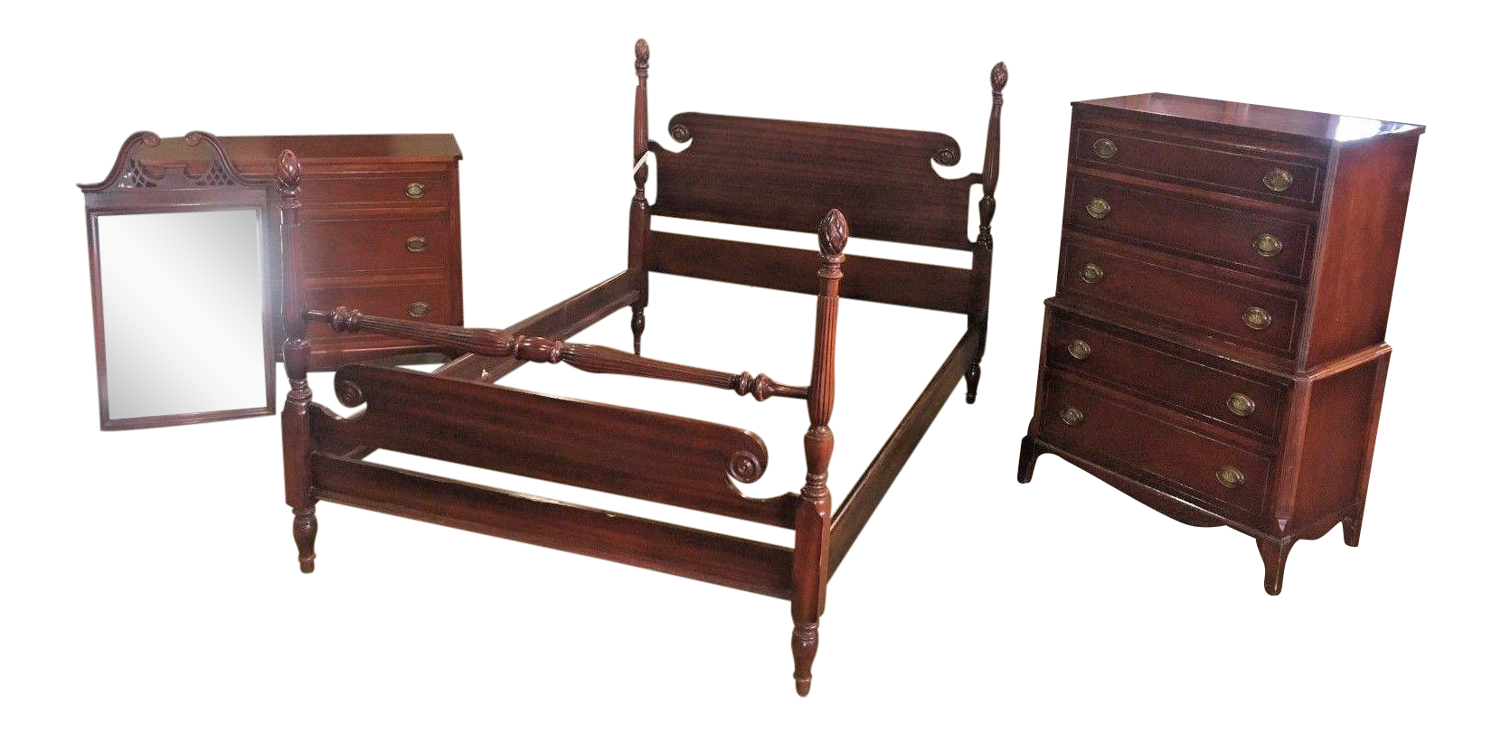 Add to favorites vintage 80s laminate lacquer brass trim headboard and night stands dresser bedroom set postmodern mcm retro beyondvintagehome 5 out of 5 stars (34. Pair chippendale mahogany four drawer bachelors chests by drexel. Antique mahogany bedroom set, empire case goods jamestown ny greensceneantiques 4.5 out of 5 stars (142) $ 3,725.00. Anyhow, the dresser you have is an antique dixie mahogany highboy commode dresser chest (if infact it is dixie). French empire antique mahogany 4 pc bedroom set queen size bed, onyx tops #37074. Art deco waterfall vintage 5 pc bedroom set queen size bed bakelite pulls #36868. When autocomplete results are available use up and down arrows to review and enter to select. Known as a two over three circa 1960's. Antique solid cherry bedroom set dresser mirror chest. Drexel chippendale collection flame mahogany chest of drawers 116 414. Excellent set by top manufacturer circa 1940s $2495.00 for remaining pieces the entire set is sold Nice mahogany bedroom set high chest dresser with mirror full queen size bed. Trying to get an idea for pricing my parents bedroom set.